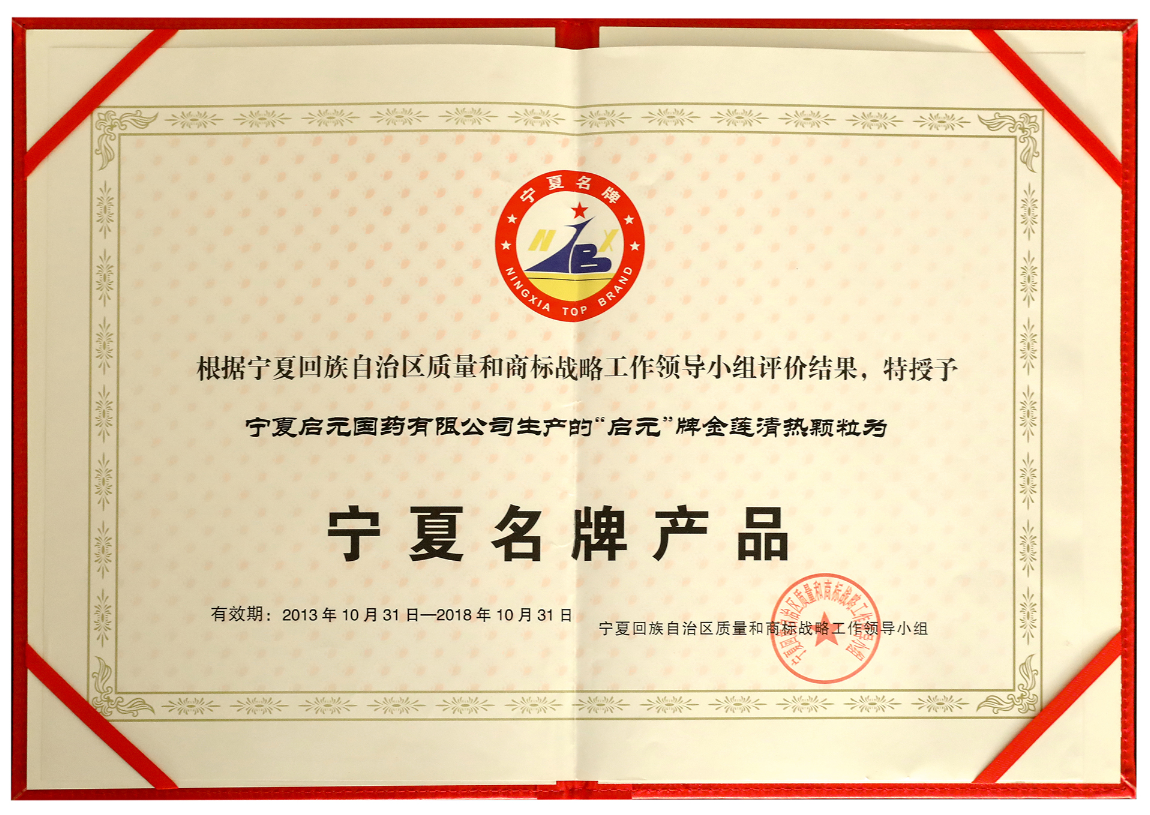 12、2008年12月,寧夏啟元國藥有限公司生產(chǎn)的“‘啟元’牌金蓮清熱顆?!鲍@“寧夏名牌產(chǎn)品”稱號。